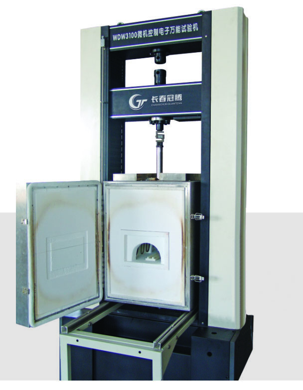 | 1700度高温试验机 一、应用范围 高温电子试验机,用于陶瓷类材料的高温力学性能测试研究。既可用于研究工作,亦可用于检测量较大的生产现场的质量控制。 可进行三点、四点弯曲强度、弯曲蠕变、压缩、特种陶瓷的拉伸性能等检测。 二、主要技术指标 试验力2T、5T、可选 工作温度:800℃—1700℃ 炉内温度变动度:±2℃以内 炉内有效尺寸:(约)宽150×深400×高200mm(可按用户试验要求设计) 三 结构及特点 电炉结构:箱式结构,前大开门,炉外体全部用不锈钢材料制成。 进行蠕变试验时可配有高精度变形(挠度)测量系统。测量灵敏度1μm,量程5mm,并带有计算机接口。 进行弯曲强度、压缩试验时,可一次装入6个试样,(弯曲试样尺寸按3×4×40mm),电炉带有试样自动推送系统,一次升温可完成多个试样试验。 配备有可工作到1600℃的压杆、支承系统。 带有独立的水冷循环系统(含水箱、水泵等)。 电炉安装于支架车上,可在主机上前后移动。 电炉采用的耐火度达1600℃的轻质保温材料,绝热性能好,炉体质轻。 测温采用双铂铑电偶,控温采用精度为0.2级,显示灵敏度为0.1℃的智能型控温仪并带有计算机接口。